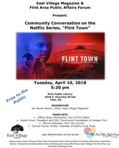 Ed Note: A community conversation about the eight-part Netflix series “Flint Town,” co-sponsored by East Village Magazine and the Flint Area Public Affairs Forum, is set for 5:30-7 p.m. Tuesday, April 10 at the Flint Public Library. Thanks to Ed Bradley for reviewing the series in advance of that event. The series, directed by Zackary Canepari and Drea Cooper, was released March 2. Flyer for the April 10 event reproduced below.