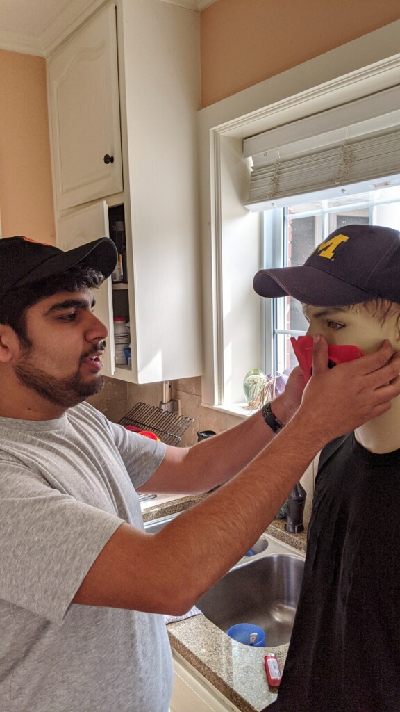 Nikhil Mukkamala fits a mask on a mannequin (photo by Bobby Mukkamala)