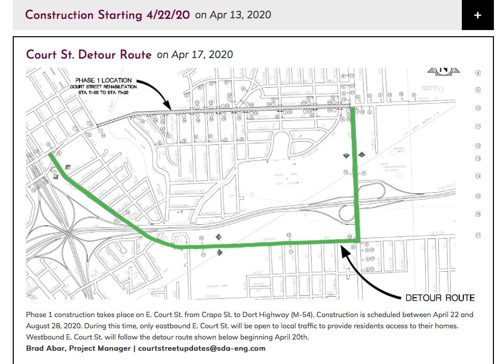 For the duration of the project, only eastbound Court Street will be open, with westbound motorists detoured from Court to Dort Highway and north onto Lapeer, onward to the I-475 overpass re-connecting with westbound Court downtown. A map from the contractor website shows the pathway: