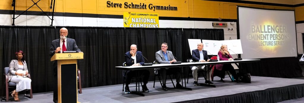 The forum was a part of the Ballenger Eminent Persons Lecture series, which has been presenting important speakers since the early 1950s. More than 200 people attended the event, held in the Ballenger Field House on the Mott Community College campus, on November 13, 2025.