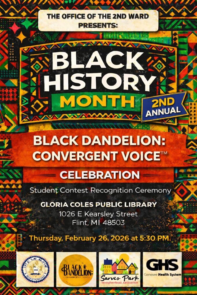 The Second Annual Black History Month Contest & Celebration will take place on Feb. 26 from 5:30 p.m. to 7:00 p.m. at the Gloria Coles Flint Public Library, located at 1026 E. Kearsley St., in the C.S. Mott Foundation Community Room.